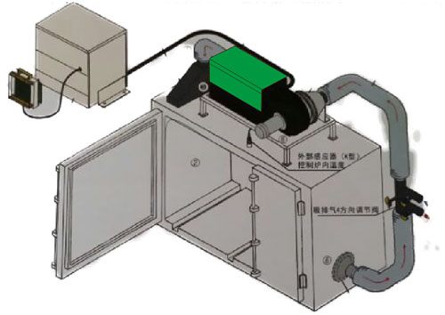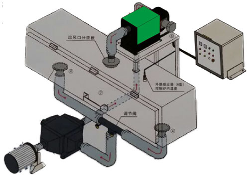 循環(huán)烤箱是用顯數(shù)儀表與溫度傳感器的連接來控制工作室的溫度,采用熱風(fēng)循環(huán)送風(fēng)來干燥,熱風(fēng)循環(huán)系統(tǒng)分為水平送風(fēng)和垂直送風(fēng),均經(jīng)過專業(yè)設(shè)計,風(fēng)源是由電機運轉(zhuǎn)帶動送風(fēng)風(fēng)輪,使吹出的風(fēng)吹在電熱管上,形成熱風(fēng),將熱風(fēng)由風(fēng)道送熱工業(yè)烤箱的工作室,且將使用后的熱風(fēng)再次吸入風(fēng)道成為風(fēng)源再度循環(huán)加熱,大大提高溫度均勻性。如箱門使用中被開關(guān),可借此送風(fēng)循環(huán)系統(tǒng)迅速恢復(fù)操作狀態(tài)溫度值。